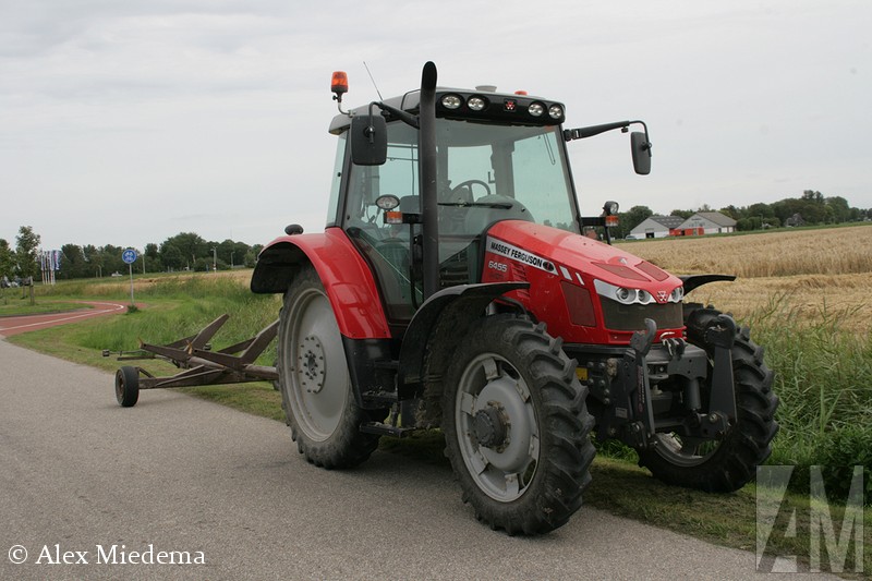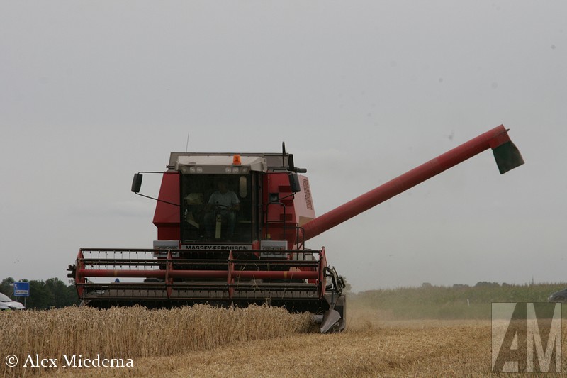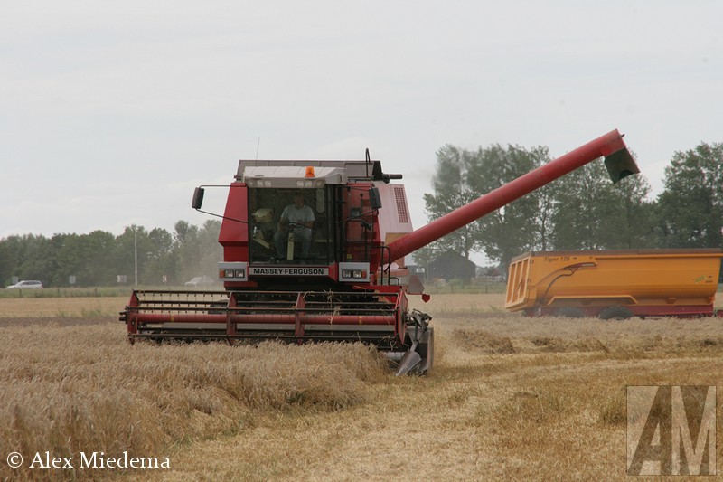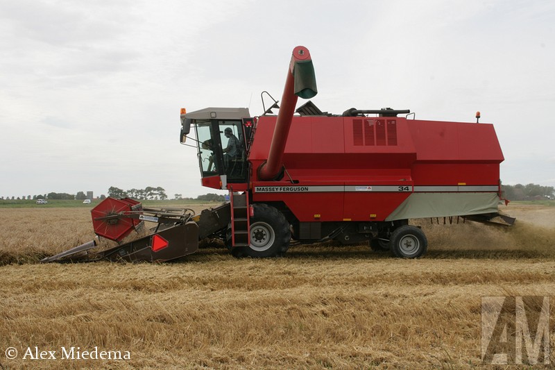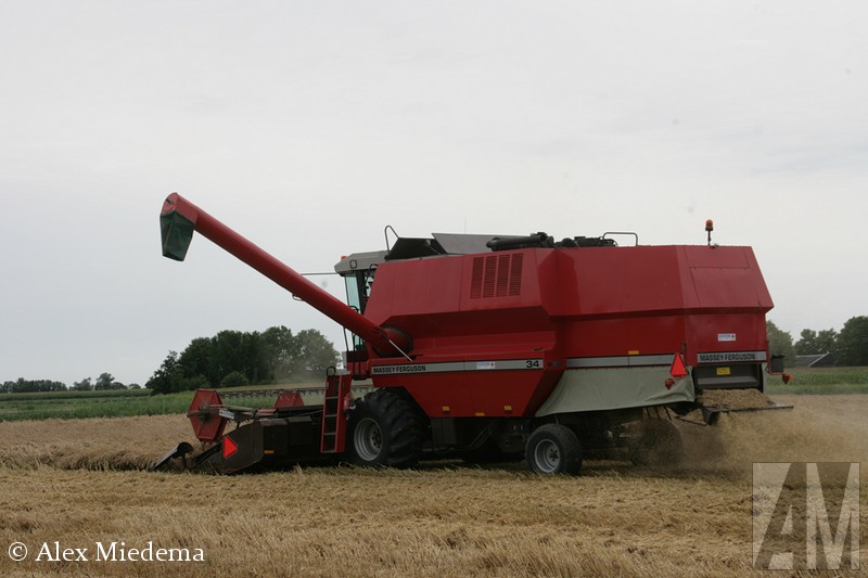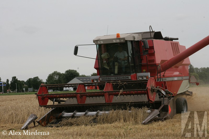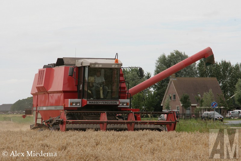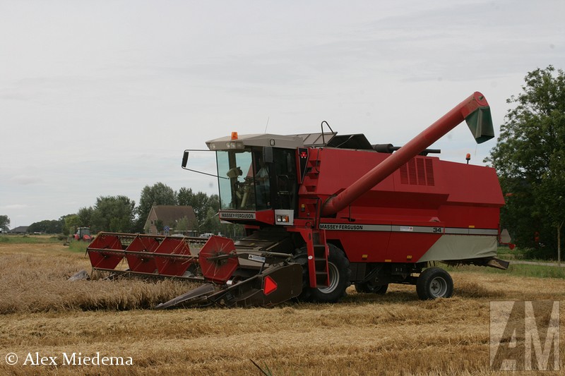 De tractoren van Massey-Ferguson zie je hier in de regio vrij regelmatig, men is schijnbaar goed te spreken over de mechanisatiebedrijven die dit merk leveren. Combines van ‘MF’, zoals dit merk meestal kortaf wordt genoemd, zijn echter een stuk schaarser. Vlak buiten Stiens was er vandaag dan toch één in actie, een Massey-Ferguson 34. Ook de ondersteunende tractoren komen bij MF vandaan, voor de afvoer van het graan staat er een 5613 klaar, terwijl een 6455 Dyna-6 de maaibek over de weg transporteert.
